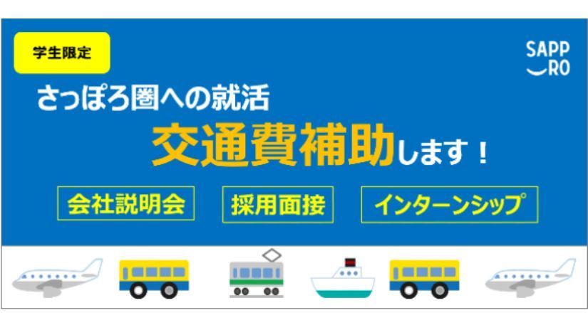 北海道外からさっぽろ圏での採用面接・試験、インターンシップに参加する学生の交通費の一部を補助します!