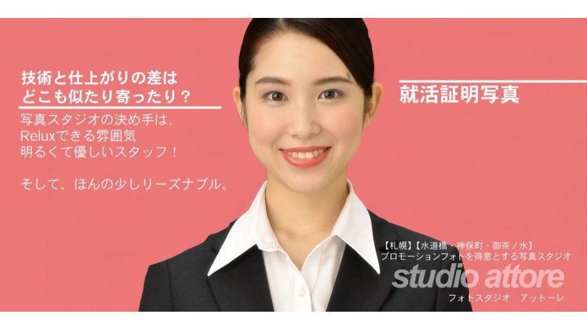 札幌駅北口にある「スタジオアットーレ」では、履歴書やエントリーシート用の証明写真をプロのカメラマンが撮影します。個々に合わせたライティングやコミュニケーションであなたの最高の表情を引き出し、納得の1枚をセレクトできます。また、全ての写真がレタッチ付き。プロのレタッチにより、自然で綺麗な写真に仕上げます。写真は当日受け渡しも可能です。是非、詳細は「詳しくはこちら」からチェックして下さいね。